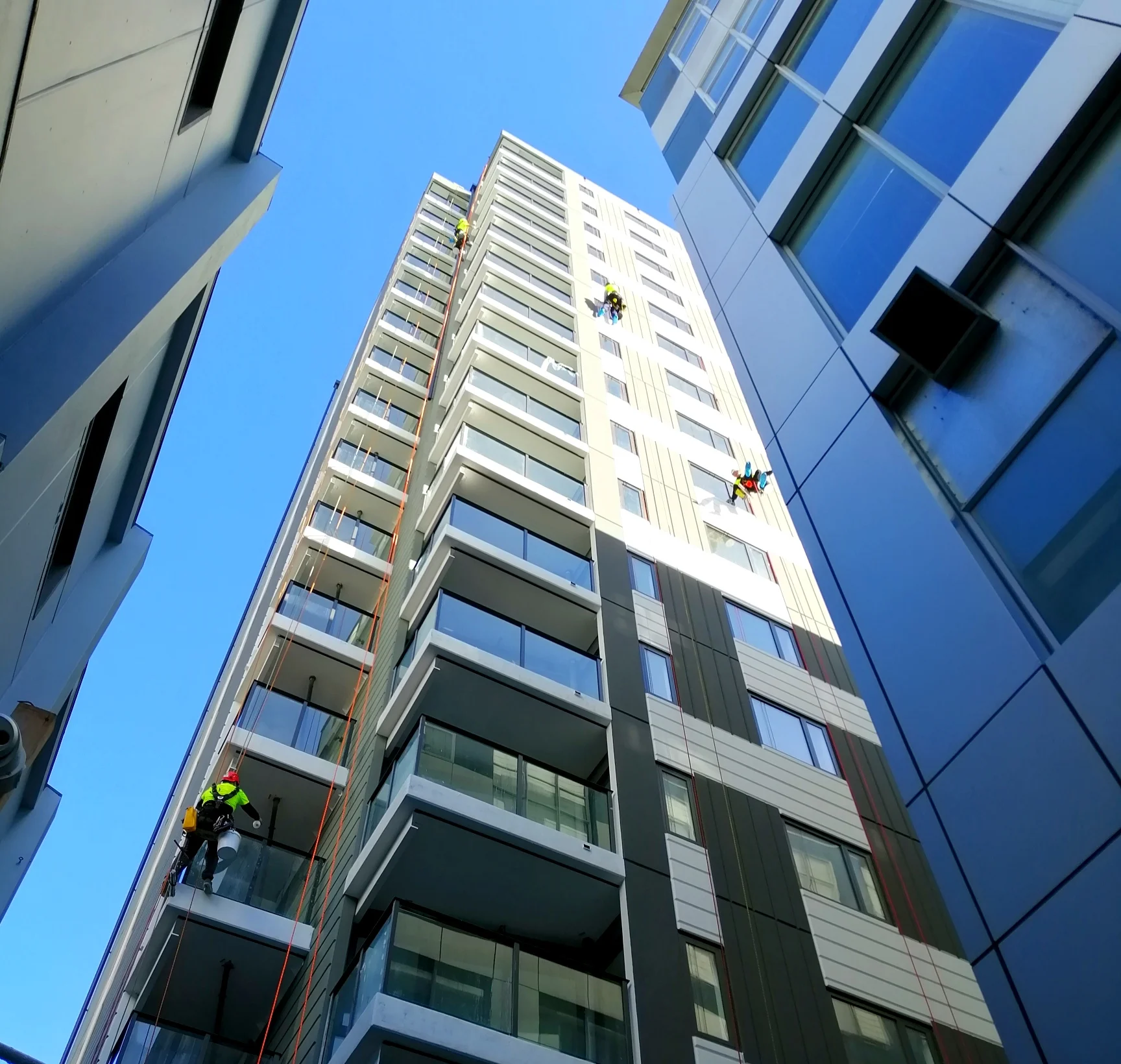 Window cleaning off ropes is in our opinion is the best access method of all, using abseil access can bypass heavy equipment such as B.M.U’s, E.W.P’s, and Scaffolding where you can run into all sorts of access issues, Road & Footpath permits,set up and break down which can add more cost to the overall project.
